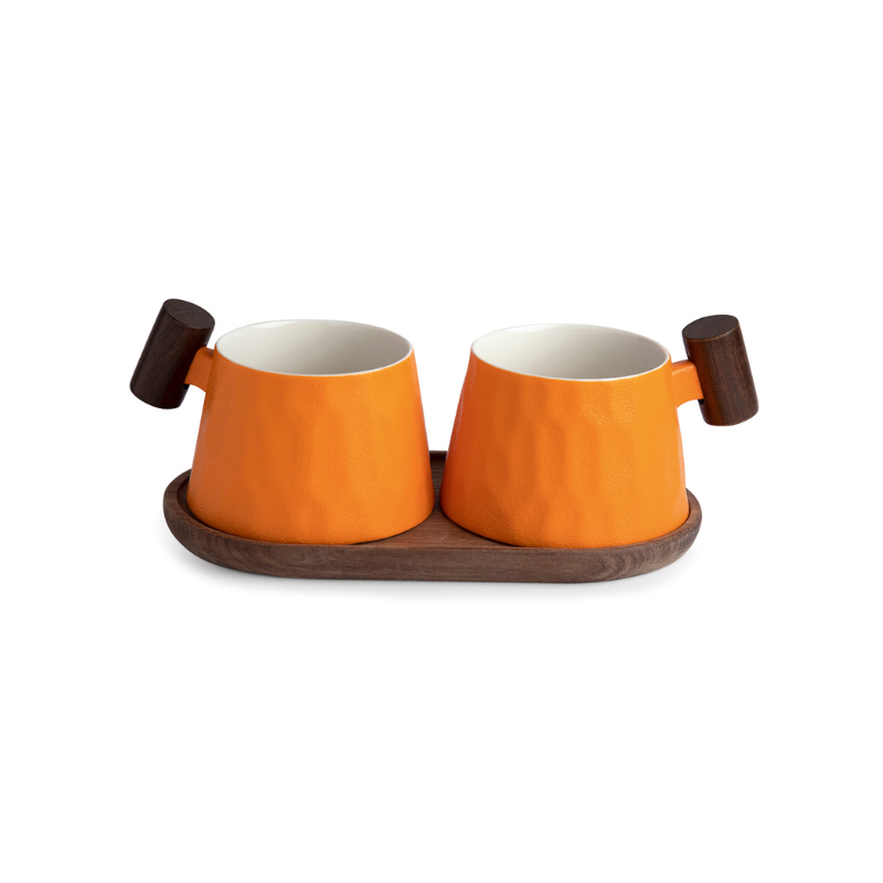 Set vsebuje dve skodelici z lesenim ročajem in lesen podstavek.