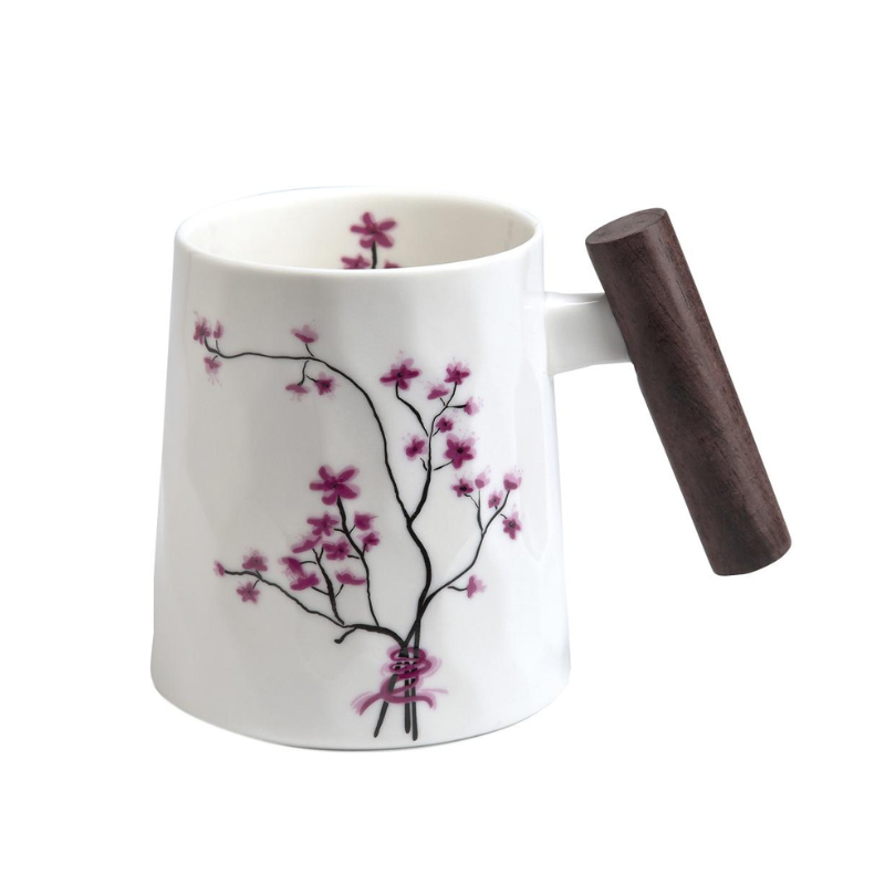 6Skodelica z lesenim ročajem s priljubljeno poslikavo cvetoče japonske češnje.