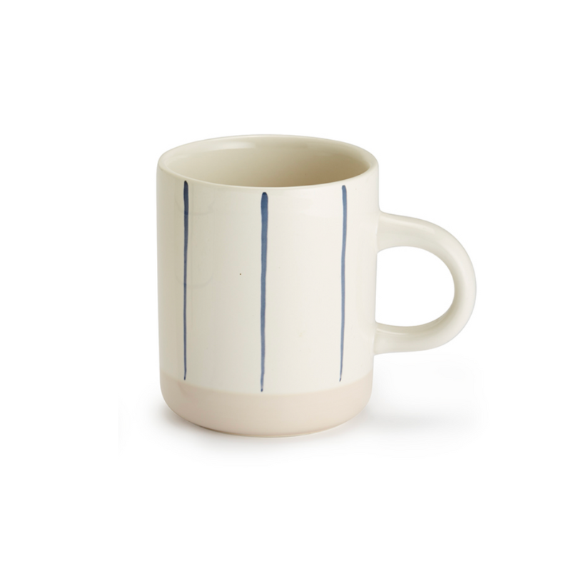 Skodelica s preprostimi pokončnimi modrimi črtami, značilnimi za skandinavski dizajn, ki povdarja geometrijske vzorce in subtilno estetiko.
